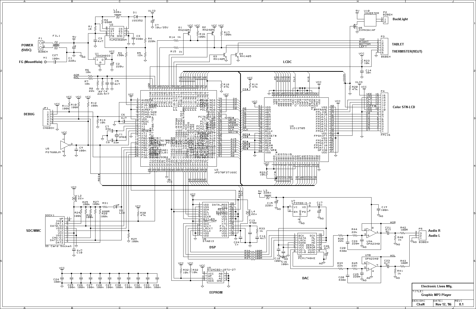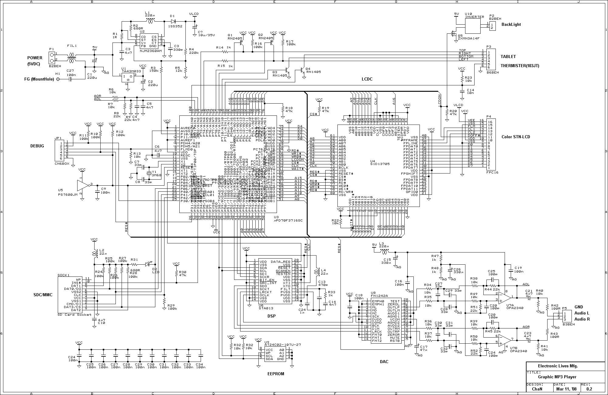 Right image shows the block diagram and the circuit diagram of built MP3 player. It has a feature that it has a large color LCD and a touch screen. Followings describe on each block.