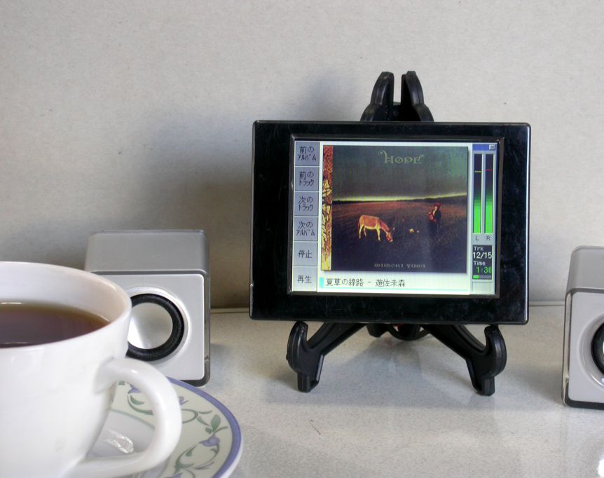 The track informations, title, artist, track number, number of tracks, play time, progress bar and level meter, are displayed on the screen during playing state. Their color, layout, font and background picture can be configured with a configuration file. The command buttons are fixed to left side because the usability will worse and the screen is stained with fingerprints if the command buttons frequently move anywhere.