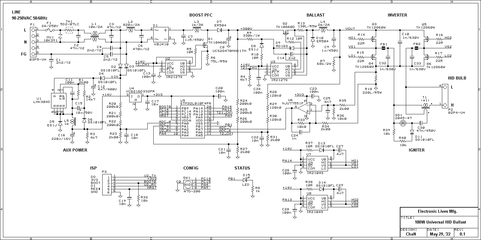 The luminaires of incandescent light bulb and the fluorescent bulb used for household lightings for long time got outdated within 10 years of widespread of LED lamps and currently only light bulbs are supplied for the replacement. Also low wattage HID lamps are gradually being replaced to th LED lamps. High wattage HID lamps still occupy the mainstream of large scale lightings because the less advantage of LED lamps in this class. As many LED freaks did, I also built an LED luminaire because of its rarity, but when it becomes a commonplace, it is no longer interesting. On the ohter hand, my nostalgia for the glass tubes disappearing from our life increases and I have begun to collect the HID lamps as a light bulb maniac. However, there is no sense in having only light bulbs. Lamp ballasts rated for each bulb are needed in order to light the HID lamps. Therefore, I designed and built an electronic HID ballast that can light the various HID lamps.