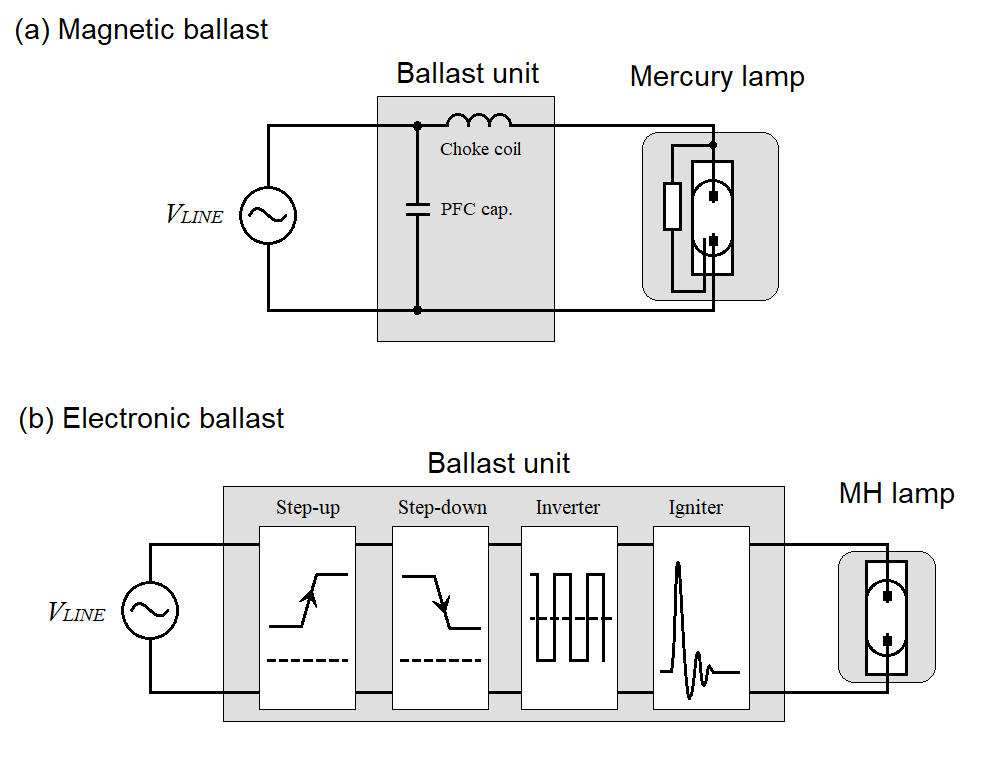In order to light the discharge lamps, an impedance element called electrical ballast is needed to regulate the current through the discharge tube. This is the same reason as inserting a resistor in series with the LED. In the case of discharge lamps, it is driven by a supply form mains, so as shown in Figuer 1a, a choke coil (inductor) is used for the impedance element to reduce the resistive loss and stabilize the arc. The electronic ballast replaces the current control function of choke coil with a compact and lightweight electronic circuit.
