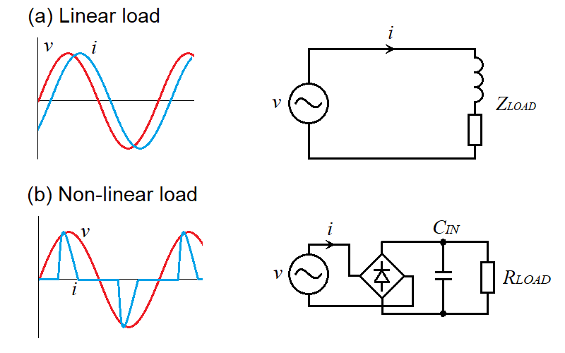 The voltage waveform of the mains is almost a sine wave, and the frequency is 50 or 60 Hz. When the connected load is a linear load such as incandescent light bulbs or induction motors, the current waveform will be a sine wave that is almost the same as the voltage waveform, regardless of whether the power factor is good or poor (Figure 2a). However, some type of loads are non-liniear and this type of load creates harmonic current in addition to the mains frequency. For example, conventional SMPS unit in capacitor-input creates a non-sinusoidal input current as shown in Figure 2b. Non-sinusoidal current waveform contains harmonic components depends on the degree of distortion, and the harmonic component do not contribute to real power. This meams that the harmonic current lowers the power factor, but it is not the only problem. As the number of such loads increases, the harmonic current emitted into the mains is getting to cause various problems.
