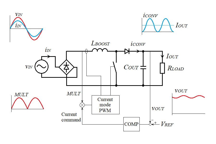 The boost converter is in current mode control as shown in the figure. However, unlike a generic current mode converter, the instantaneous value iIN of the input current is controlled to be a value of the current command multiplied by the instantaneous value vIN of the input voltage. This makes iIN proportional to vIN in steady state, as the result the PFC circuit behaves as a pure resistive load from viewpoint of the mains.