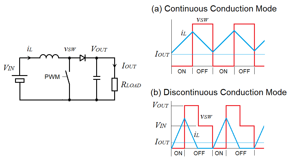 There are two conduction modes how the current flows through the inductor. The one is continuous conduction mode (CCM) in which the current flows continuously over the switching cycle. The another one is discontinuous conduction mode (DCM) in which the current stays zero in a part of switching cycle. (Figure 4) CCM tends to be used in relatively high-power circuits, and DCM tends to be used in low-power circuits, but each has its own features and the use is not that clearly determined.