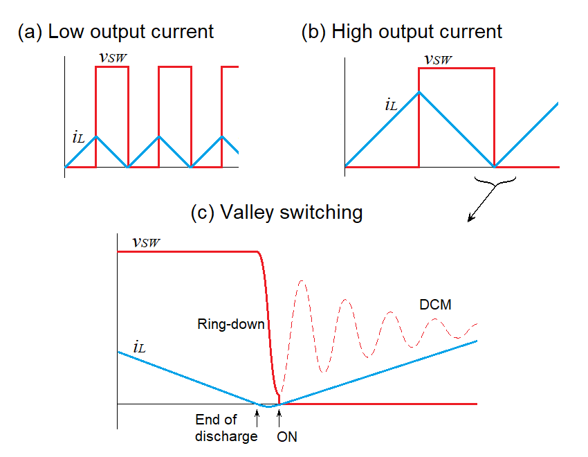 Actually, there is yet another conduction mode that operates at the transition point between CCM and DCM. I found it is referred in varoius words in various thesises, shch as critical mode (C-CCM), transition mode (TCM) and boundary mode (BCM), but here I will refer to it as critical mode (C-CCM). In order to keep the operation in C-CCM, the switching frequency changes as variation of operating conditions (Figure 5a-b).