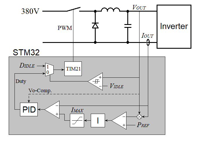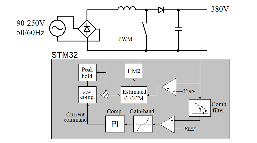 Figure 6 shows the system diagram of the implemented PFC feature. These controls are driven in an interval timer (LPTIM1) in 31.25 kHz. To reduce the processor load, PFC process is divided into two phases, current control and voltage contrl, so PFC control is updated at 15.625 kHz, but still sufficient rate for PFC function.