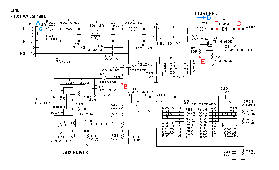 Figure 7 shows the schematic of the PFC part. The red and blue symbols in the schematic correspond to the probe point in the screenshots shown in this document. STM32L010 has only four timer units in total. TIM2 is used for step-up PWM, TIM21 is used for step-down PWM, LPTIM1 is used for controls of both converters, and SysTick is used for the supervisor, so there is no timers left. Every features I wanted could be implemented and all I/O pins are occupied for each feature.