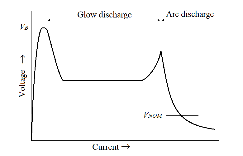 Figure 10 shows the voltage-current characteristics of HID lamp. This is a well seen characteristics of a discharge tube, but the breakdown voltage of HID lamp is higher than vacuum lamp such as fluorescent lamp, because the gas pressure of HID lamp (about 0.1 atom) is mush higher than vacuum lamp (about 0.0001 atom). The breakdown voltage VB of HID lamp is about 1 kV for DC, 2 to 3 kV for pulse.