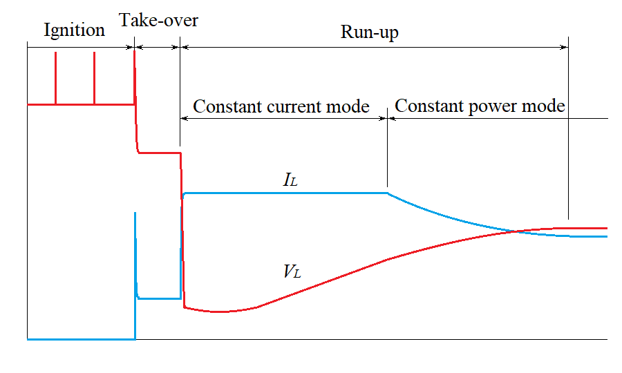 After a discharge began, a suffcient current (make the power higer than quarter of rating but not exceed two times of lated current) neededs to be supplied. The lamp impedance in glow discharge is 1 kΩ or higher, so the lamp voltage considerably higher than the rated voltage is required. When a hot spot is formed on the electrode and arc discharge began, the lamp impedance drops drastically. If the take-over failed and the discharge extinguished, high voltage pulses will be applied agan. This process goes on almost instantly.