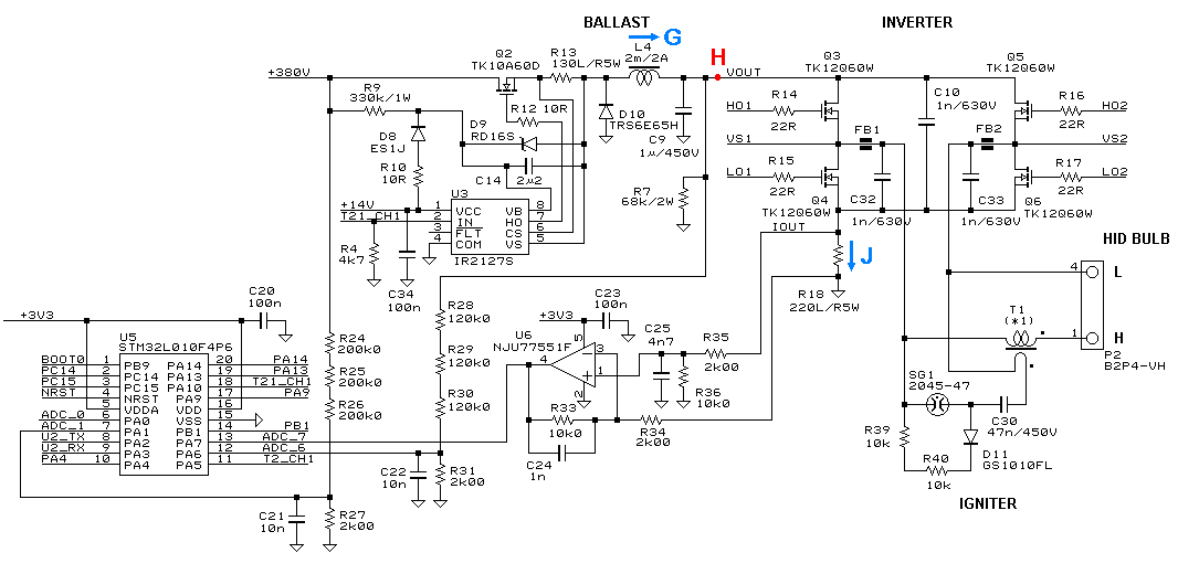 T1 is the ignition transformer in Core: B66317GX187 (g=0.2 mm), Sec: 50 turns of #26 Kynar wire (L=440 μH, Isat=2.5 A) and Pri: 6 turns of #24 Kynar wire.Figure 15 shows the waveform of the ingition pulse at no wire connection. It reads the 6 kV of peak voltage and very fast transient, 60 kV/μs, so tracings on the board needs to be in a special attention. I have not encountered a malfunction of MCU, but some transistors and gate driver in the H-bridge are sometimes failed by the high volatege pulse discharged and run somewhere on the board. Since the pulse voltage is attenuated by the stray capacitance of the cable to the lamp, the maximum cable length (typically about 1.5 meters) is defined in the specifications of the electronic ballast.