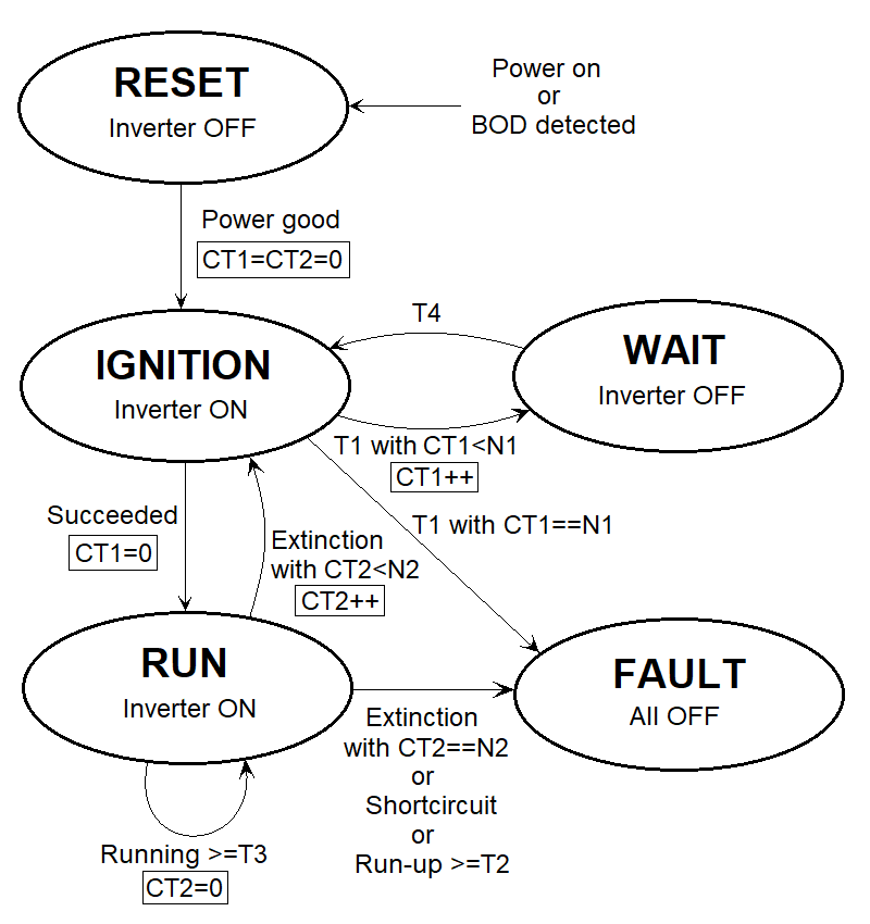 Inverter is disabled to prevent to output the ignition pulses continually. Wait for T4 time and go to IGNITION state.