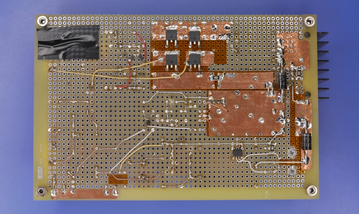 I saied it is without a current sensing, but a shunt resistor is used by a gate driver with trip feature (IR2127S). This is to protect the circuit from an overcurrent due to a transient, a program bug or some malfunctions. The trip feature does not work in normal operation. Also the timer unit of the STM32L010 has pulse-by-pulse trip feature, but it requiers some external components, so I used a useful gate driver instead.