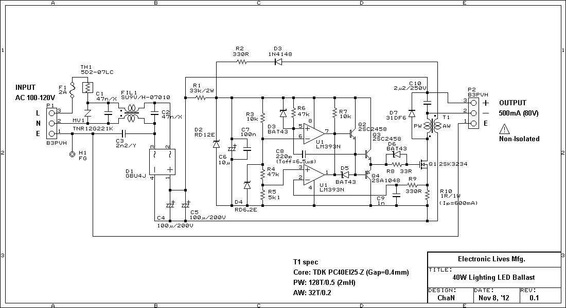 Lighting LED, unlike LED indicator, consumes power at least 1 watt and reaches upto ten watts or higher. It requires a lighting LED driver whtch is called ballast. The right image shows the built ballast board and the circuit diagram. The circuit topology is a simple buck converter. It will not need to describe the principles. Because the output is not isolated from AC input, proper insulation and grounding to the load circuit, especially at LED mountings, is required to prevent electrical shock. When test it on the workbench, it should be supplyed via an isolation transformer, or instruments may be damaged.