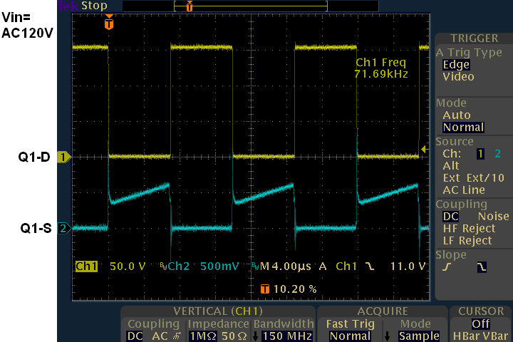 I chose only generic components for the ballast circuit and avoided to use ASSP IC, so that the components will be easily obtained. However there is only a difficulty that the transformer T1 have to be hand-wound denends on each configuration. The reason of using a transformer is for auxiliary power supply. When output voltage is changed, also number of turns of AW must be changed to set 20 volts of induced voltage at off-state. The T1 can also be replaced with a generic inductor (2mH/1A) with additional power dissipation by changing R1 to 12kΩ/3W. To adjust the output current, replace R5 with a trimmer pot and able to trim upto 50 watts under current configuration.