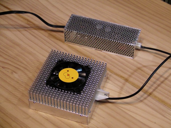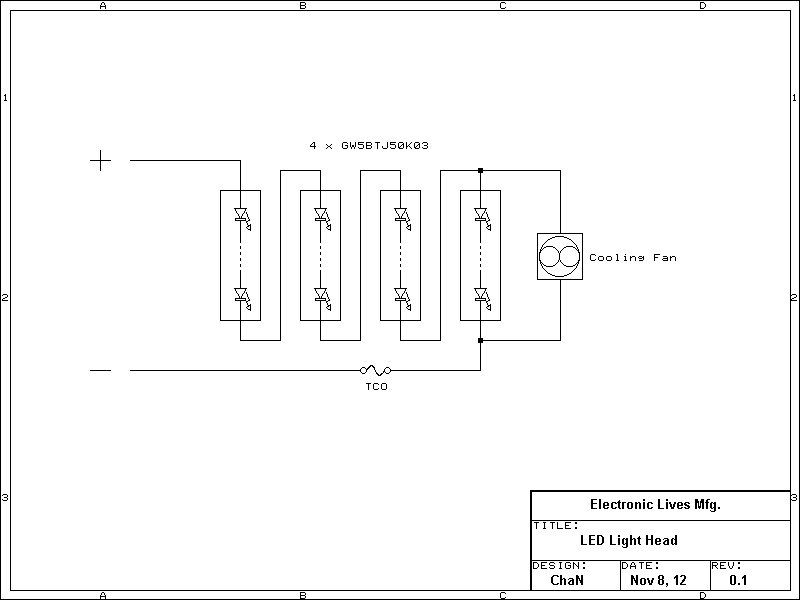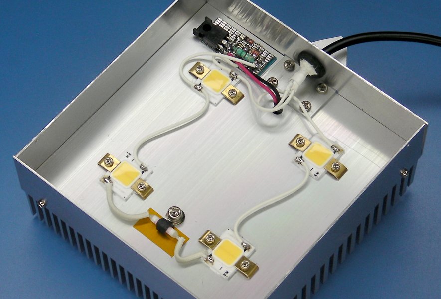 The right image shows the built LED light head. The LED lamp used in this project is GW5BTJ50K03(10W/5000K) by Sharp. The LED lamp is mounted on the heat sink directly and wired four LED lamps in series. The heat sink is in dimension of 100x100x25mm and is capable of 15-20 watts of thermal dissipation at natural convection and upto several times at forced flow. Using a cooling fan shuld be avoided if possible but it is required in this poject due to power dissipation of 40 watts. The power supply for the cooling fan is got from LED driving power. The failur of cooling fan results burn out of LED lamps , so that a TCO fuse must be installed to protect from over heating.