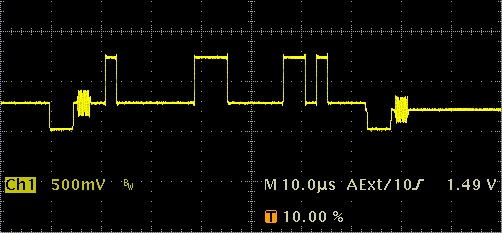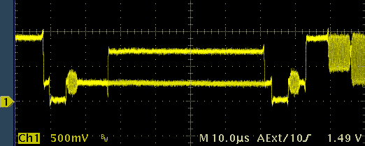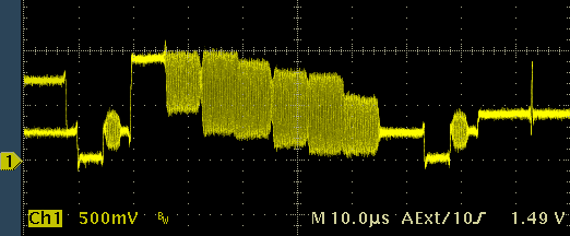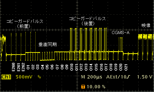 右の波形は、コピーガード付きDVDソフトの垂直ブランキング期間全体を納めたものです。この期間には3種類のコピーガード信号が含まれます。また、可視部分の同期パルスのレベルが低くなっているのが分かります(何を意図してそうしているのかは分かりませんが)。