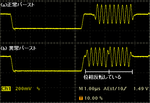 右の波形は、正常なラインとカラーストライプのラインの水平ブランキング期間を取り込んだものです。カラーストライプの部分ではカラーバーストの位相が途中から反転しているのが分かります。バーストの位置もなんか変です。