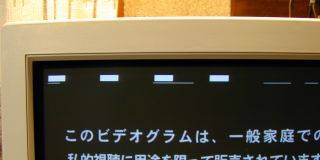 さて、ビデオソフトの中にはブランキングエリアに細工をして不正コピーを防止しているものがあります。この信号は、ラインセレクタの使い方を覚える練習用としては恰好のソースとなります。コピーガードのかかった映像ソースかどうか判断するには、テレビのつまみ(垂直サイズか垂直位置)を回してブランキングエリアを画面に映してみるのが最も手軽です。コピーガードがあると、右のIMGのようにコピーガード信号を見ることができます。