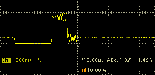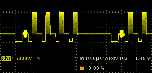 右の波形は、残光時間を長めにして取り込んだもので、パルスのレベルが固定ではなく変動しているのが分かると思います。パルスレベルが低いときは正常に録画できて、高いときは真っ暗ということになります。