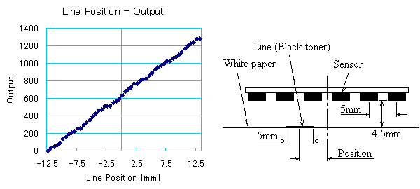 右の図に実際のライン位置とセンサ出力から算出されたライン位置の対応を示します。内部的には、±12.5mmのライン位置がセンタ値640の0〜1280の範囲の値で得られています。処理的には、白い部分の出力レベルを基準に黒ラインに近い2個のセンサの出力比で算出しているだけです。