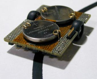 このライントレーサの場合、2個の動輪と1個の従輪による三点支持としています。動輪は車体の左右に配置され、その回転を個別に制御することによって走行・旋回する、走るロボットとして最も一般的な形式です。この方式はステアリング機構が不要で小回りがきくという利点があります。従輪は車体の動きに合わせて自由に向きが変わるキャスターのようなもので、しばしばスライダで置き換えられることがあります。動輪は7mmベアリングにタイヤを履かせた物で、従輪は5mmベアリングを自由に向きを変えるようにラフマウントしたものです。