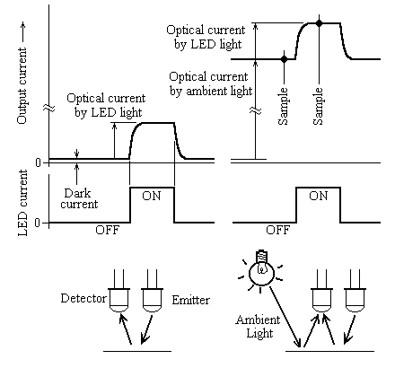 この回路の場合は、環境光をキャンセルするため右の図のようにパルス光を使用しています。この場合、LEDがOFFからONに移行する前後のセンサ出力の差が純粋なLEDによる光電流となります。いわゆる同期検波ですが、隣接センサの投光器からの影響を排除するため各センサを順にスキャンするにはこの方が好都合ですし、またマイコンによる制御に適しているといえます。