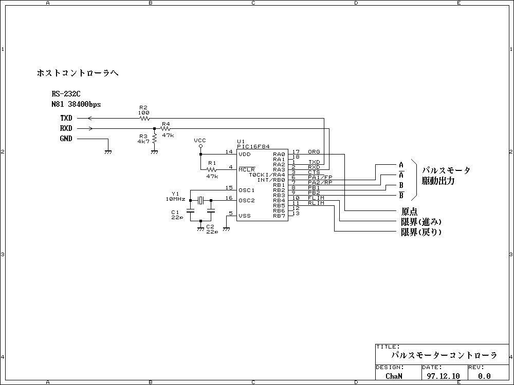 ホストからのコマンドでパルスモーターを制御するインテリジェントなパルスモーターコントローラです。マイコンチップには、最近流行の PIC16F84を使用してみました。