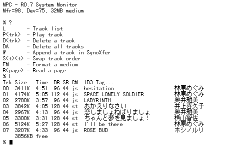 ISPケーブルで接続、シリアルデータフォーマットは N81 38.4kbpsです。電源を入れる前に通信ソフトを起動しておかないと、ER信号が "H"にならないので、リセットが解除されず電源が入りません。トラック追加では MPEGデータを同期シリアルモードで高速転送するため、途中で専用プログラムを起動する必要があります。したがって、実際には DOSの通信ソフトが必要になります。転送速度は、25KB/sec〜35KB/sec程度となります。オンラインモードで使用可能なコマンドは次に示す通りです。