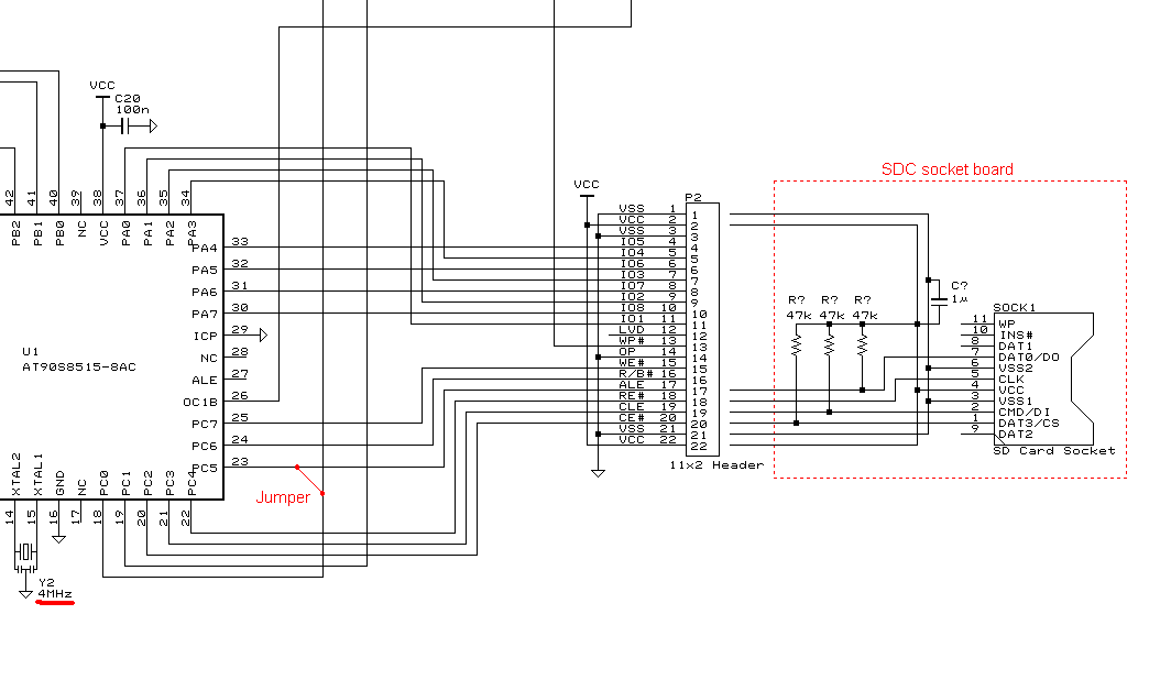 幸いにもSDCの電源電圧はSMと互換性があり信号線数もSMよりはるかに少ないので、回路的に容易にSMを置き換えることができます。さらにうまいことに、ソケット部がソケット基板として独立しているので、SDC用のソケット基板を作ってこれに差し替え、F/Wを書き換えるだけでOKです。右の写真に元のSMソケット基板と製作したSDCソケット基板を示します。メイン基板については本来は改造は必要ないのですが、データ転送の高速化のためジャンパを1本飛ばします。これにより320kbpsのMP3データでも音飛びすることなく再生できるようになります。