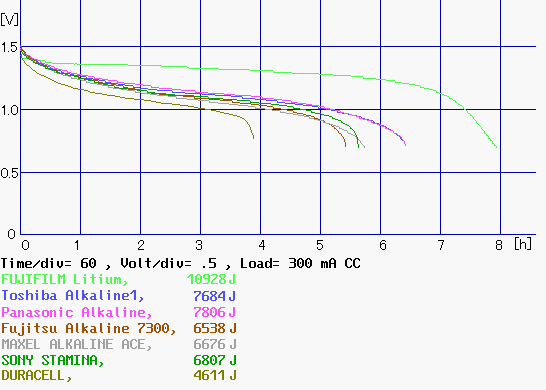 で、右の図がその結果(電池ベンチじゃ(^^))。300mAの定電流負荷で測ったので、MP3プレーヤの動作条件とは異なります。スイッチングレギュレータを内蔵した機器(MP3プレーヤ、デジカメなど)は定電力負荷なので、Ah容量よりもエネルギー量(ブランド名の横に表示)で比べると良いです。つまり、同じAh容量でも放電中に高い電圧を保っているほうが長持ちというわけ。