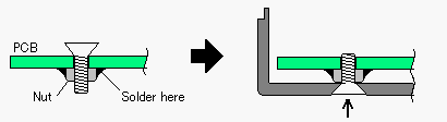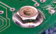 基板のマウント孔にはランドを設けてあります。これは、写真に示すようにナットを半田付けして使用するためのものです。これにより、基板を片側からビス止めすることができます。ただし、強い衝撃が加わると剥離する場合があるので注意。半田面のスペースはナットの高さで制限されるので、部品の足は短く切り詰めておく必要があるのは言うまでもありません。