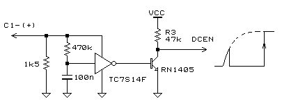 一部の DSP (MAS3507D)では内蔵 DC-DCコンバータが起動しにくいものがあるようで、PLAYボタンを押しても電源電圧が 3Vに上昇しないという症状となって現れています。これは MAS3507Dのバグで、これを回避するには電源 ON時に DCENピンを操作してやる必要があります。具体的には、DCENピンに "L"→"H"の鋭い立ち上がり波形を加えてやれば良いようです。そのための付加回路を示しますので、もしもそのような現象が起きた場合は試してみてください。一発で起動するようになります。(その旨言えば、部品を送ってくれます)