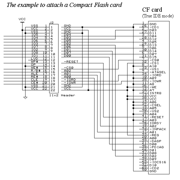 ストレージデバイスとしてスマートメディアを使っていますが、これを CompactFlashに置きかえることも簡単にできます。実際の接続例を示します。データバスは下位バイトだけしか接続していないので、8bit I/Oモードに定義して使用する必要があります。ちなみに、F/Wは公開しません(いや、まだ書いていないんで(^^;)。