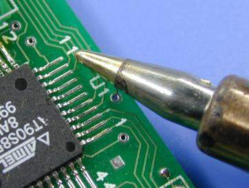 なお、QFPの半田付け作業ではこて先は先端ではなく寝かせて側面を使うのがコツで、液体が狭いところに入り込もうとする性質を巧く利用します。どうしてもブリッジが取れない場合は、半田吸い取り線で除去するのもひとつの手です。だたし、半田を取りすぎてピンの浮きが発生する場合があるので要注意。ICは長時間熱を加えても壊れることは滅多にありません。焦らずに落ち着いてやりましょう。