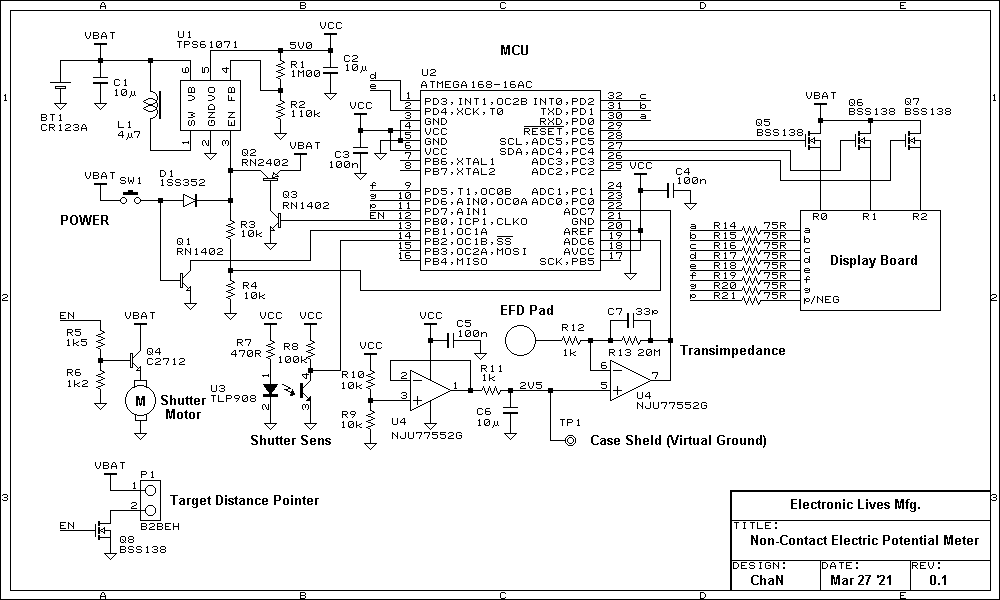 Fig.5 shows the schematic of the built surface potential meter. The charges moving in/out to the detector electrode is converted into the voltage by a transimpedance amplifier. The detected voltage is captured by an A-D converter of the MCU and then processed in software and displayed into the 3-digit 7-segment display.