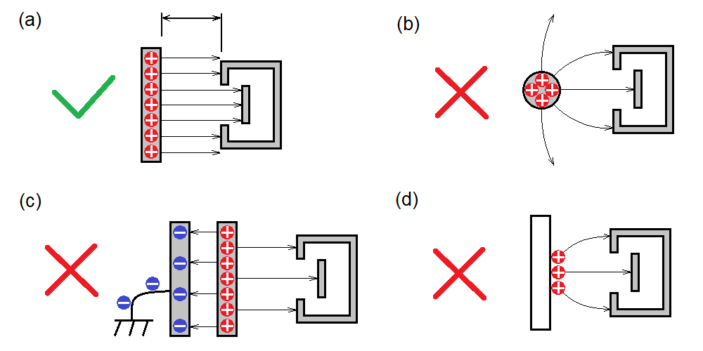Unlike generic voltage measurements, the static electricity needs to be measured in non-contact, because the potential of electrificated object is relatively high, in kV order, and the electric charge immediately drains away from the object when a contact probe is attached as shwon in Fig.1b. The charge drained out will able to be measured, but the voltage cannot be determined in only amount of charge and the measurement is destructive, it changes electric charge of the object. Also the contact probe cannot be attached in many case, because the electrification occures not on only conductive object but on the surface of non-conductive materials, such as plastic. Well then, how we can measure the surface potential of the electrificated object?