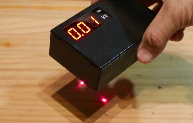 This is the same way as normal measurement but a jumper setting. The calibration mode is enabled by setting the PB3 pin low level. On power-on, detector window is covered by a grounded conductive object to get a zero-level. After zero-level calibration, "CAL" is displayed for next step. Set the meter as measuring a metal plate with +5.00 kV of reference voltage applied and turn power off. A gain calibration factor is calculated to read it +5.00 kV and stored into the EEPROM on power off.