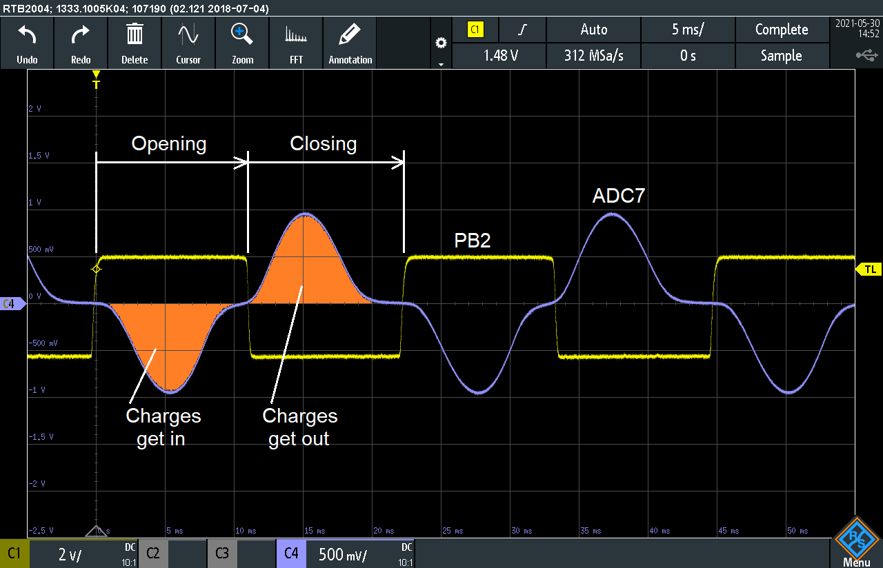 The A-D conversion is triggered in 5 kHz by TC1.OC1B. The measurement process is driven by the A-D converson complete interrupt and the process advances by shutter rotation. Measurements are done and the reading is updated every 6 rotations, the fisrt rotation for auto-null, following 4 rotations for measurement and the last rotation for battery monitoring.
