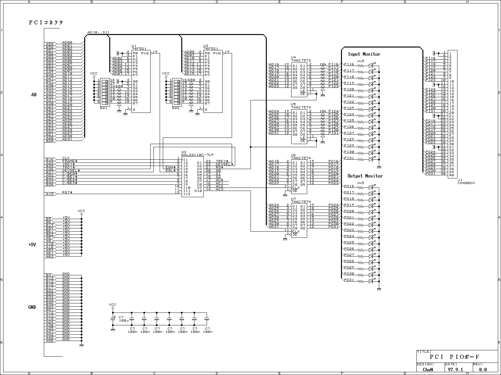 PCIではI/Oデバイスも32bitフルデコードが義務付けられていますが、このボードでは下位16bitしかデコードしていません。しかし、パソコンで使うぶんには64Kバイト以上のI/O空間に対するアクセスが発生することはないので、特に問題にはなりません。