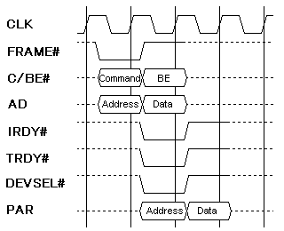 ターゲットデバイスは、2クロック目でFRAME#がディアサートからアサートに変わり、アドレスフェーズであることを検出します。同時にコマンドとアドレスを取り込み、自分に対してのアクセスの場合は、DEVSEL#をアサートして応答します。この場合は2クロックで応答しているので中速デコードです。高速デコードでもかまいませんが、AD[31:0]にデータを乗せてTRDY#をアサートするのは1クロック以上後でなければなりません。