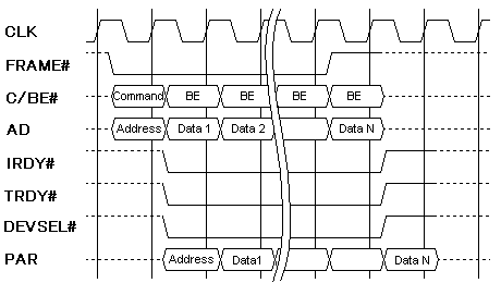バースト転送は通常のシングル転送と区別されているわけではありません。ターゲットは、データを1回転送する毎にFRAME#をチェックしていて、FRAME#がアサートされ続けている場合はデータの転送が続くことを知り、それによりバースト転送を実現しています。バースト転送は主にメモリデバイスに対して行われますが、I/Oデバイスへのバースト転送も可能です。