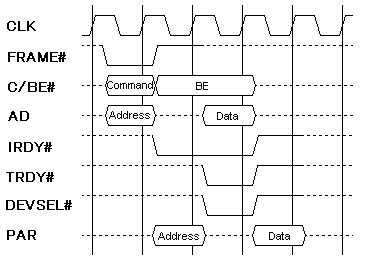 最も単純なバスサイクルです。ターゲットデバイスは、2クロック目でFRAME#がディアサートからアサートに変わり、アドレスフェーズであることを検出します。同時に、コマンドとアドレスを取り込み、自分に対してのアクセスの場合は、DEVSEL#をアサートして応答します。この場合は1クロックで応答しているので高速デコードです。