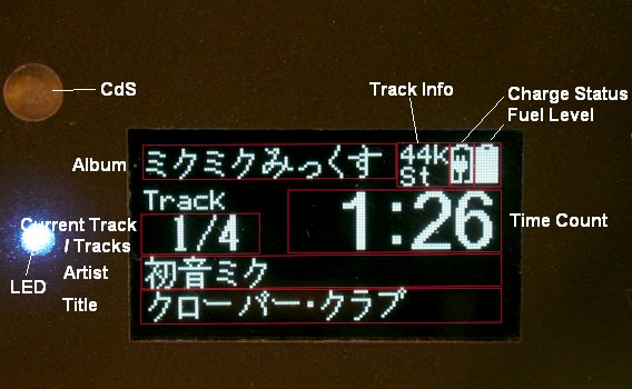写真4に表示レイアウトを示します。アルバム名、アーティスト名とタイトルは日本語対応になっています。アルバム名はそのディレクトリ名(LFN)で表示します。アーティスト名とタイトルはそのトラック(WAVファイルの INFOチャンク)から取り出しますが、無い場合はタイトルにファイル名(LFN)を代わりに表示します。しかし、コード・ページ 932(シフトJIS)で LFNサポートを有効にすると、FatFsモジュールだけでも ATmega644Pのフラッシュ・メモリがパンクしてしまいます。そこで、スペースを食う Unicode変換テーブルを圧縮することでトータル 40Kバイトほどに抑えることができました。