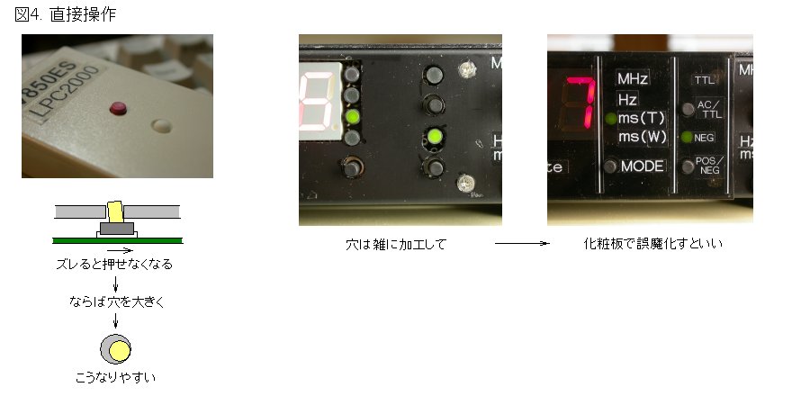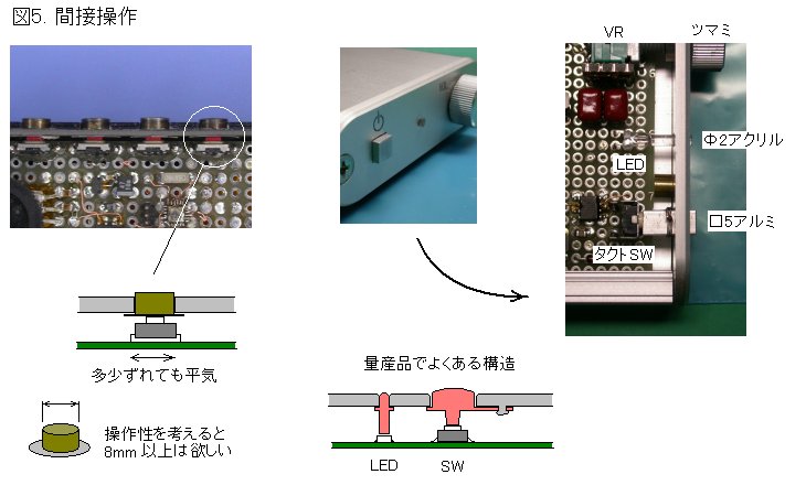 操作スイッチは誤って押されないようにケースの横に配置しました。スイッチのマウントは、タクト・スイッチの頭を直接出す構造が手軽ですが、基板の位置決めがシビアになり、外観にも難があります(図4)。このため、一号機と同様にボタン(Φ5真鍮丸棒にニッケル・メッキ)を介してスイッチを押す構造にしました(図5)。このようにすると操作性が良くなり、組み立て・部品レイアウトなど構造上の自由度も高まります。