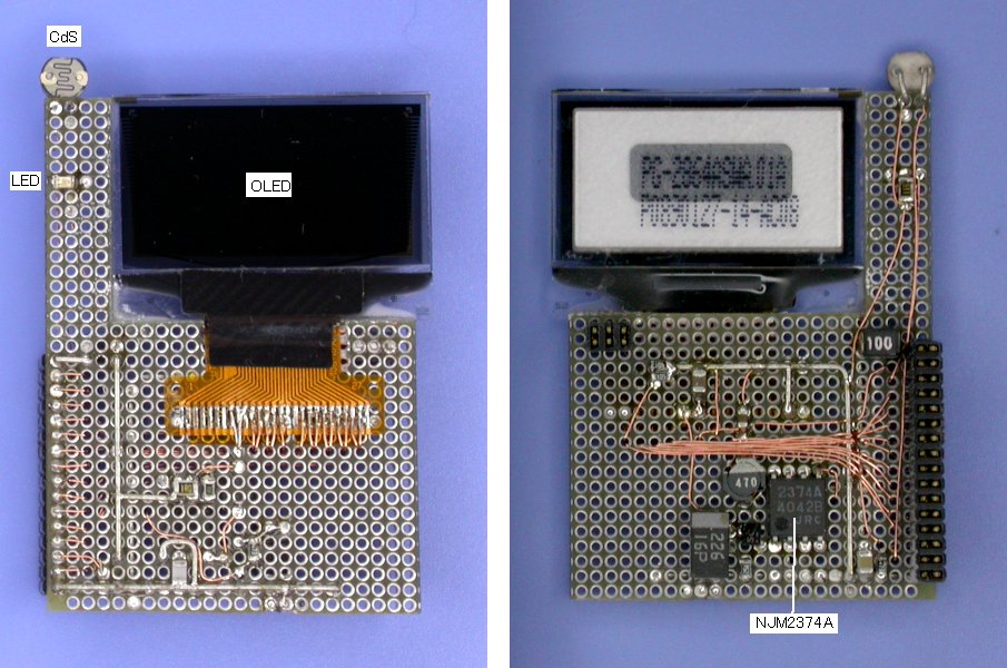 写真3・図3に製作した表示部の写真と回路図を示します。基板に載っているのは OLEDモジュールの駆動電圧(9V)を生成する DC-DCコンバータと LED、光センサ(CdS)です。光センサは外部の明るさに応じてディスプレイの明るさを見やすいレベルに制御することが目的で、最近の携帯機器では標準的に搭載されている機能です。OLEDモジュールはガラス基板単体なので、コントローラは COGになっています。厚さは僅か 1.7mmで基板とほぼ同じです。しかし、それでもスペースが足りなかったので、基板を切り欠いて埋め込むようにしています。
