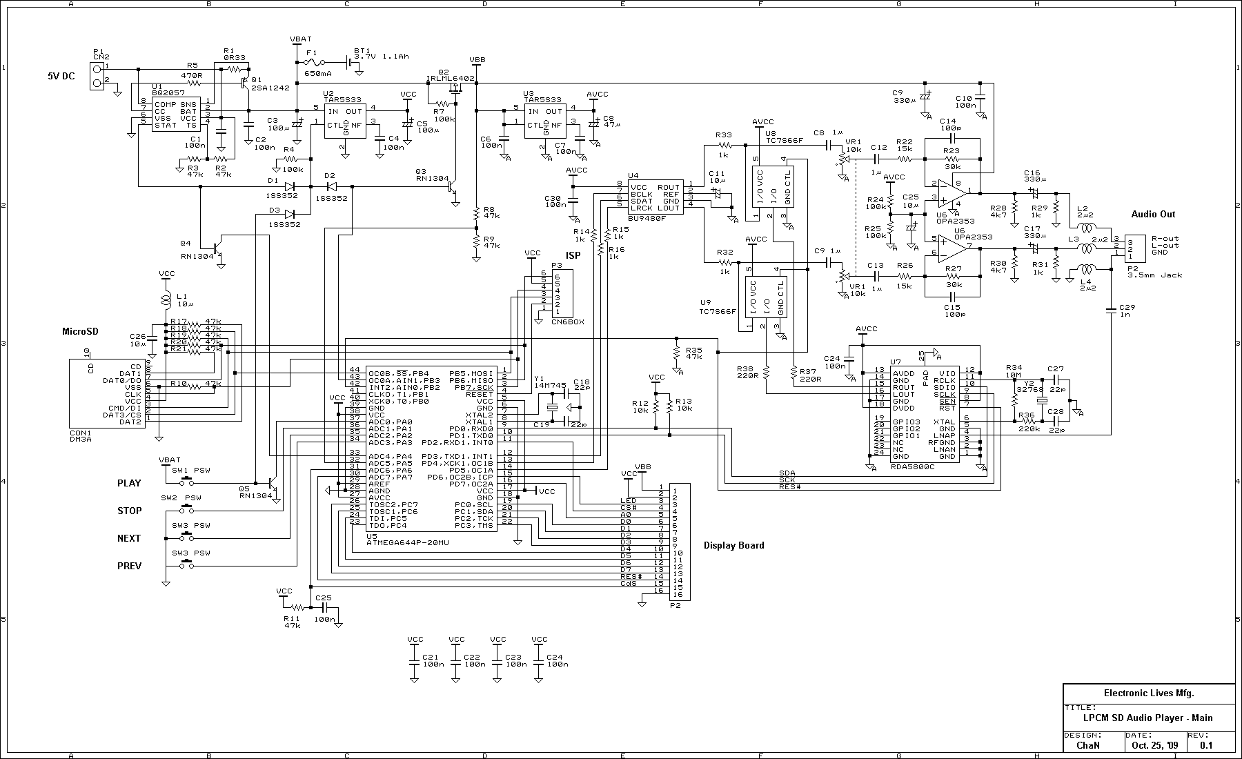 製作の動機が記録メディア置き換えなので、記録メディアを SDCに置き換えて設計すれば良いのですが、そう単純にもいきませんし、それに面白くありません。また、10年も経過するといろいろ状況が変わっています。一番困るのが部品のディスコンで、当時使用した MP3チップ・セットは既に入手困難になっています。それに代わる現在の定番品(VS11xx)は、オーディオ性能(特に SNR)があまり良くなく、静かな室内でヘッドホンで聴くには難ありなレベルです。もちろん、屋外とか車載用なら全然問題になりませんが、SNRを気にするならそれらの使用は避けたいところです。