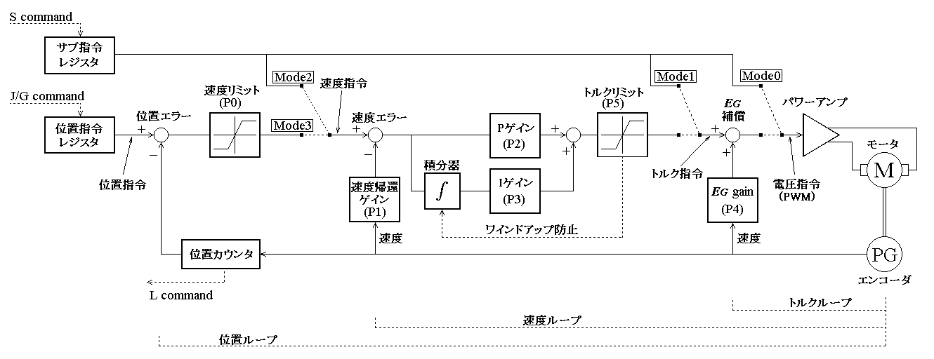 サーボ動作モードを切り替えます。これは、サーボ演算(図5)のデータパスを切り替えるものです。同時に位置指令レジスタ、サブ指令レジスタ、位置カウンタをリセットします。モード番号とサーボ動作モードとの対応は右に示すとおり。