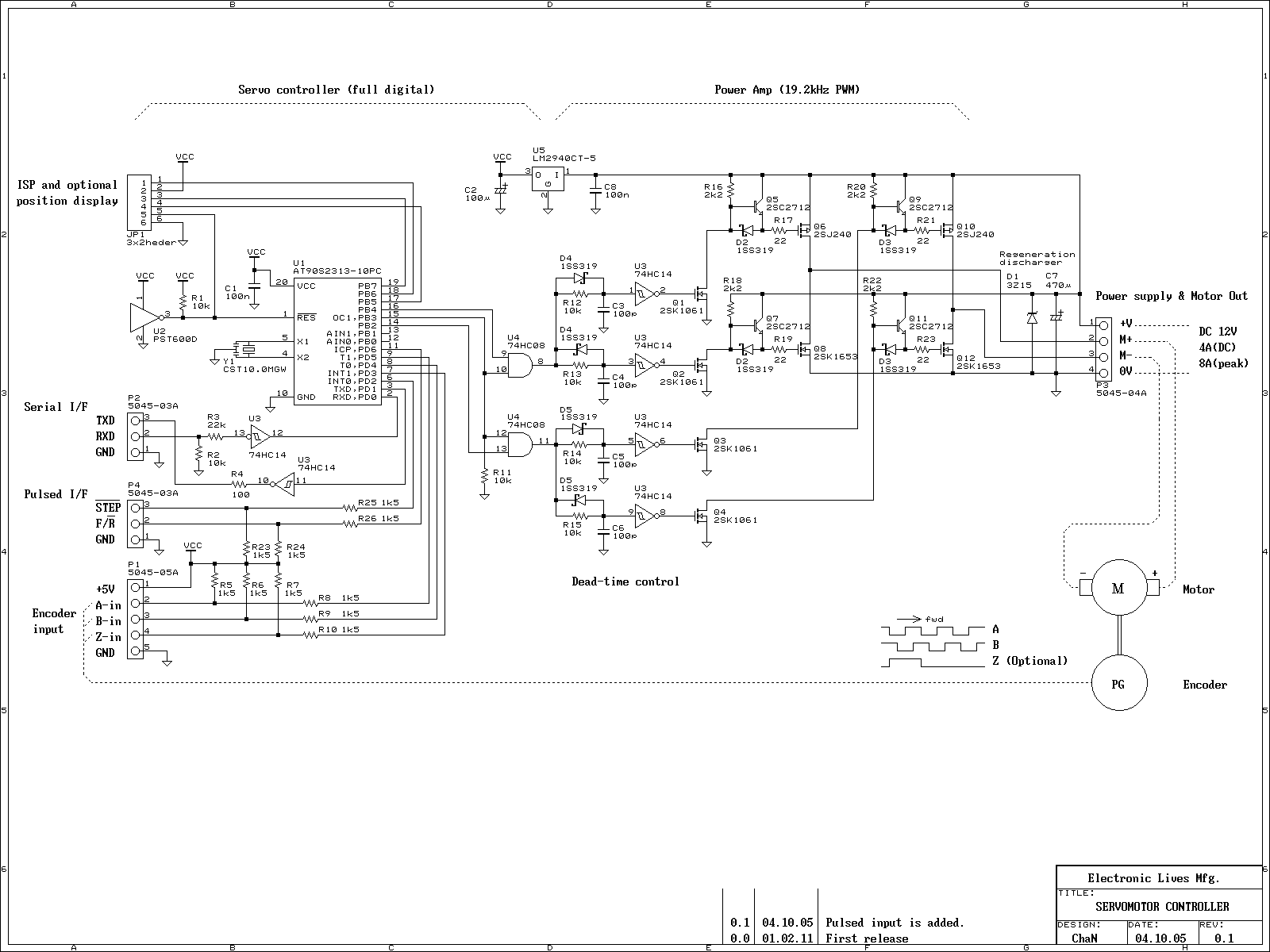 図2にサーボコントローラの回路図を示します。AVRは、モータ位置捕捉、サーボ演算、電圧出力などのサーボ制御およびホストコマンドの処理など殆どの機能を受け持ちます。パワーアンプ部は高効率なPWMモードのHブリッジモータドライバで、12V動作では50W程度までのモータを駆動できます。JP1はISPコネクタですが、動作中は使われないので、オプションの位置カウンタ表示器を接続するようにしています。P2はホストインターフェースで、パソコンのシリアルポートなどに直結して制御できます。P4はサーボコントローラで一般的なパルス入力です。