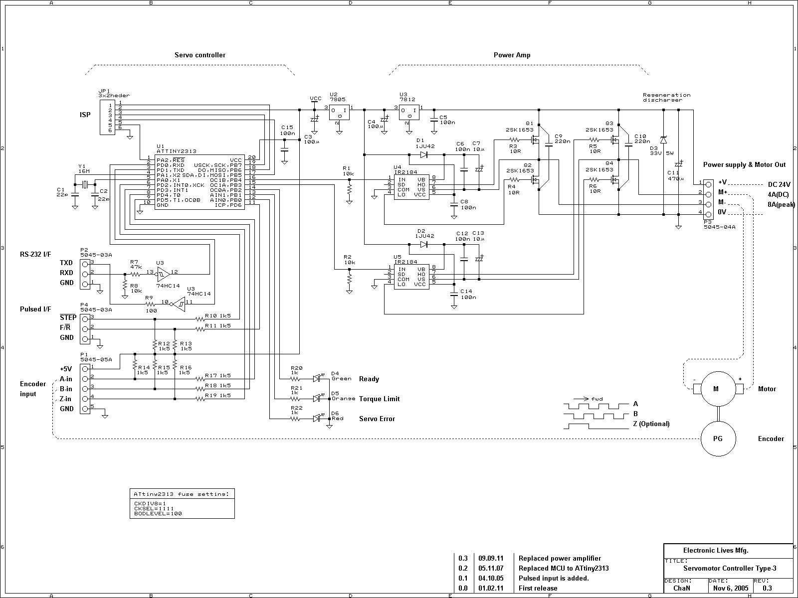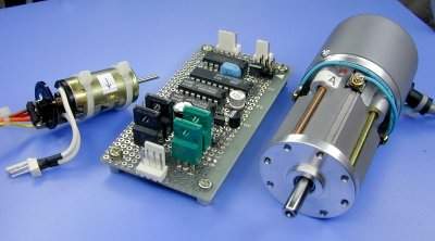 演算処理の図からも分かるように、データパスを切り替えることにより4つの異なるサーボ動作モード(電圧制御モード、トルク制御モード、速度制御モード、位置制御モード)が選択可能です。それぞれの動作は、そのシリアルインターフェースを経由してパソコンなどのホストコントローラで制御できます。また、ファームウェアのちょっとした変更で完全に独立したモーションコントローラとしての動作も可能です。