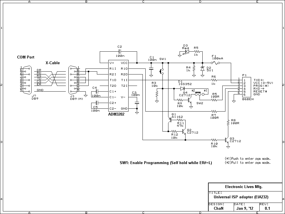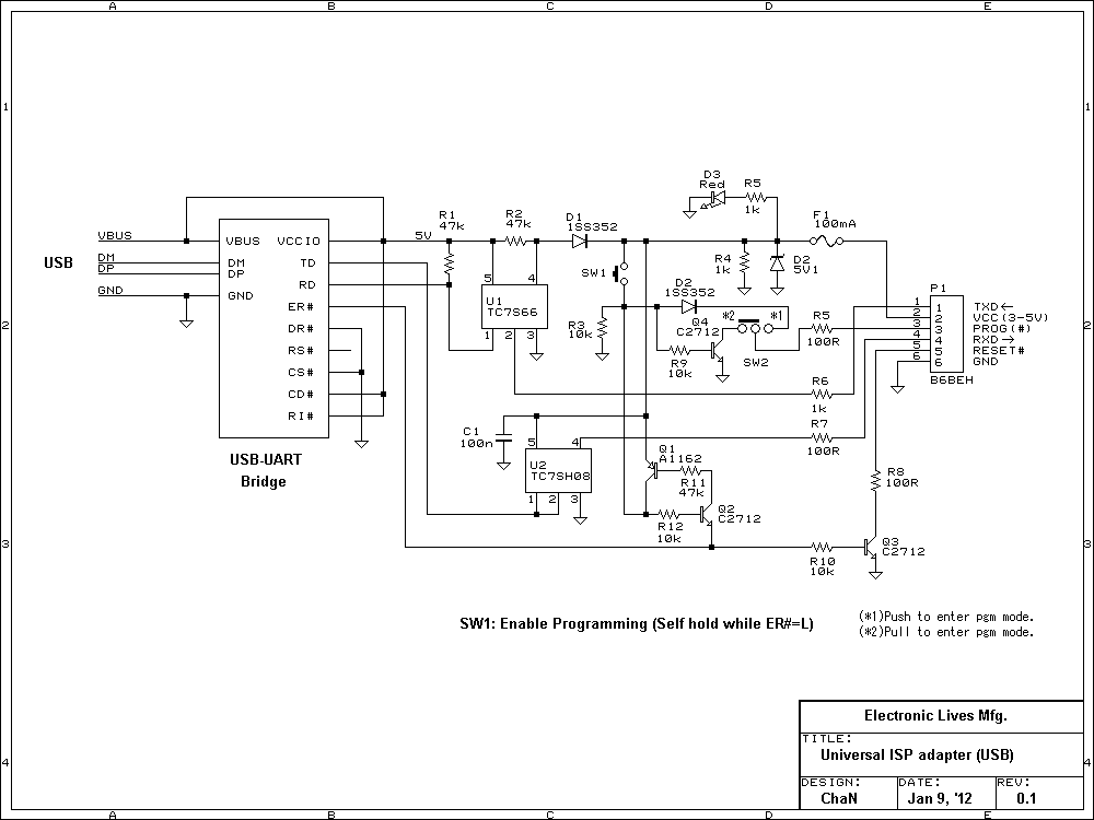 V850ESのフラッシュ書き込みでは、調歩同期シリアルとクロック同期シリアルの2通りの通信方法があり、このアダプタの場合は前者を使用することになります。SW1の状態は書き込み中(ER#=L)は自己保持するので、書き込み開始の瞬間だけ押さえていればOKです。なお、書き込みモードでの起動(FLMD[1:0]を[L,H]でリセット解除)をターゲット基板上のスイッチなどで行う場合は、PROG信号の配線やSW1の操作は必要ありません。他のマイコンの書き込みモード起動(特定の入力の下でリセット解除)についても同様です。
