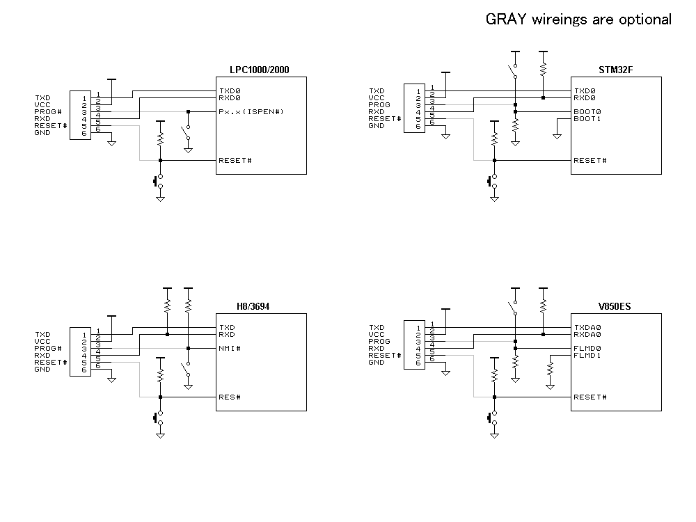 単純なUSB-UART変換器のデータ信号にリセット/書き込み制御信号を追加したものです。したがって、汎用のUART通信アダプタとして、これらのマイコン以外でもデバッグ・モニタなどちょっとしたUART通信に利用することができます。ターゲットの電源電圧は3~5Vの範囲に対応します。ターゲットの電源が落ちている場合は入力が切り離されるので、0を受信しっぱなしになることはありません。RESET#をターゲットのリセット回路に接続した場合、端末プログラムによるポート・オープンでリセット解除となります。PROG信号は書き込みモードへの移行を指定する信号で、通常はHi-Z、SW1を押すとH/Lレベル(極性はSW2で選択)を出力します。
